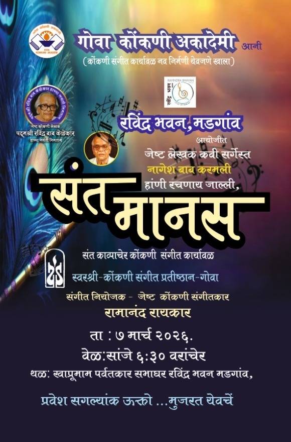 Santh Manas 4 4 people viewed this event. Register for event To register for this event please visit the following URL: → Date And Time 07-03-2026 @ 06:30 PM Location Ravindra Bhavan, Margao Event Types Goa Konkani Academy Event Category Musical Show Share With Friends Facebook Twitter Linkedin Xing Pinterest Share: